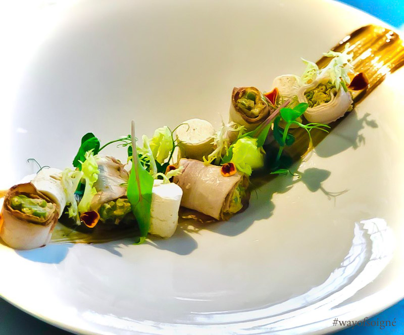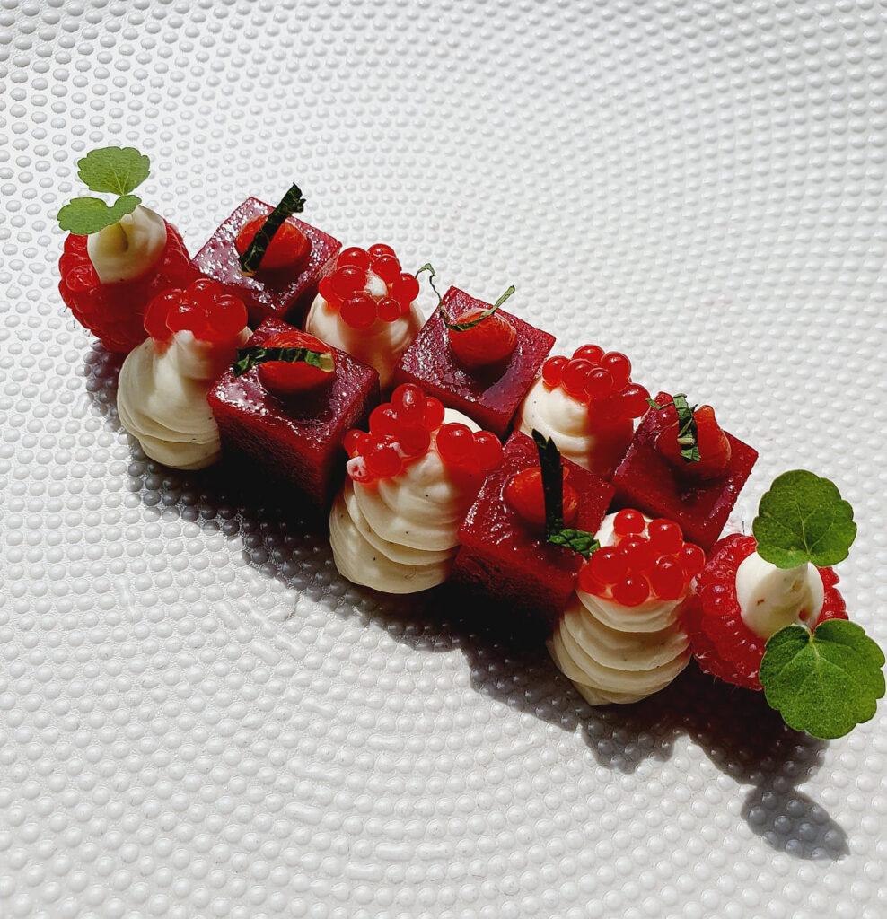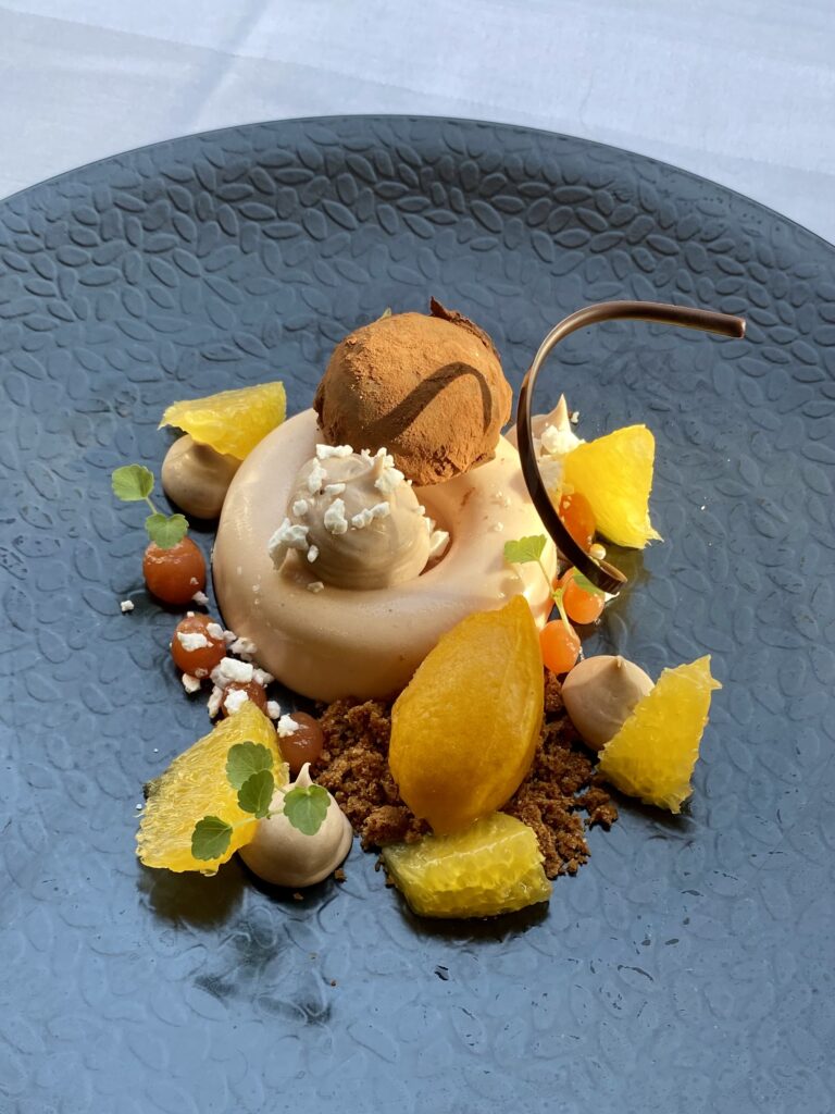 in specerijensiroop gegaard | slagroomtruffel | pandancrème |kokosgel | pecannoot | yoghurt-serehijs